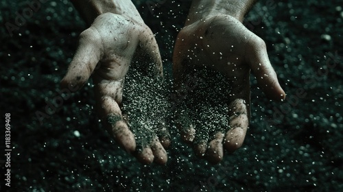 Close-up of hands scattering seeds over dark soil, emphasizing growth and agriculture, with blank space for overlays.