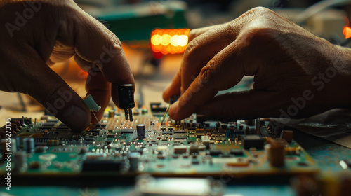 Close-up of hands skillfully working on an intricate electronic circuit board, highlighting precision and technology.