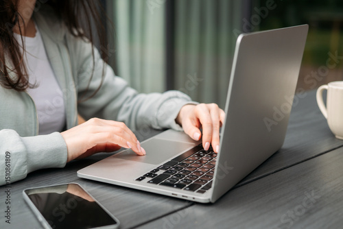 Close-up of hands typing on a laptop outdoors with a coffee mug and tablet on the table.