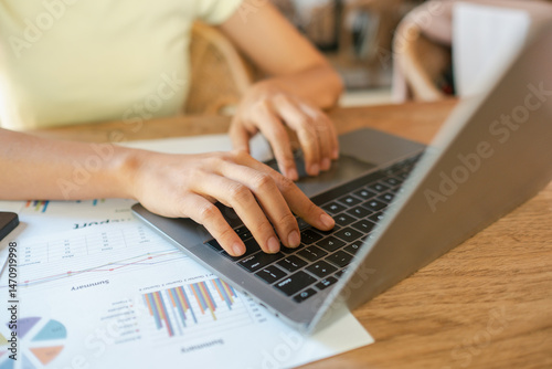 Close-up of hands typing on a laptop with financial documents on a wooden desk, showcasing a productive work environment.