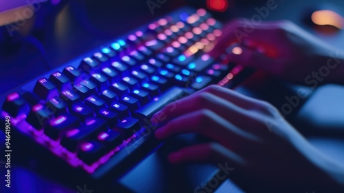 Close-up of hands typing on a mechanical keyboard, RGB lighting effects illuminating the keys