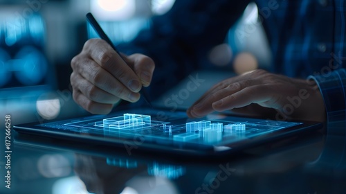 Close-up of hands using a digital tablet with a stylus, creating a 3D architectural model in a modern workspace.