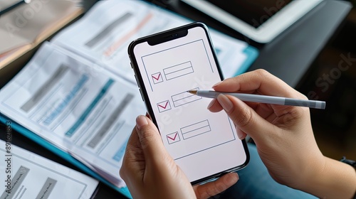 Close-up of hands using a pen to fill out a digital form on a smartphone, with documents and a tablet in the background..