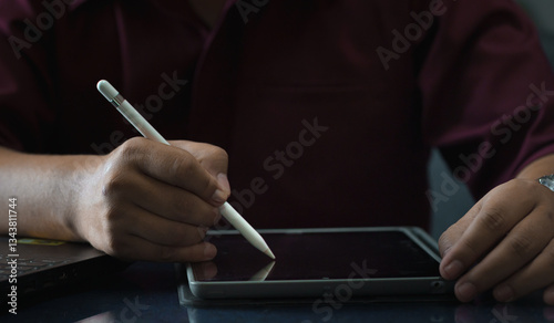 Close-up of hands using a stylus on a tablet, symbolizing digital work, technology, and creativity. Perfect for concepts of innovation, productivity, remote work, and modern business solutions.