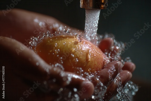 Closeup of hands washing a mango under running water in a Brazilian kitchen