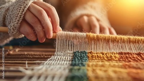 Closeup of hands weaving fabric on a loom, vibrant threads in motion