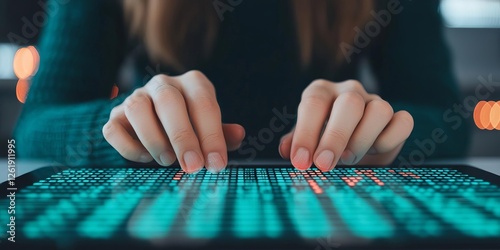 Close-up of hands working on a digital touch screen with vibrant visual display.