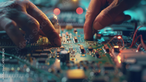 Close-up of hands working on an intricate circuit board, illuminated by various tiny lights, capturing the essence of precision and technology.