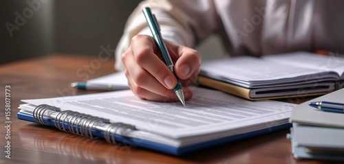 Close-up of hands writing on paper, notebooks, and documents, planning, flat
