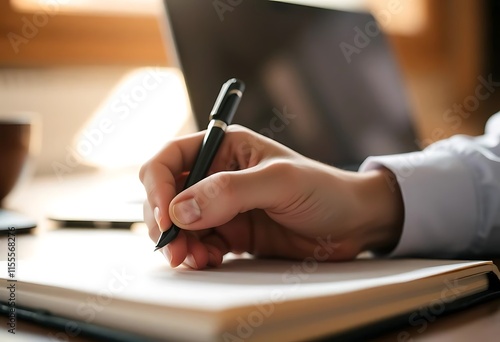 close-up of hands writing, pen on paper, laptop in background, office desk, natural lighting, business attire, productivity, note-taking, workplace, focus, detail-oriented, professional environment