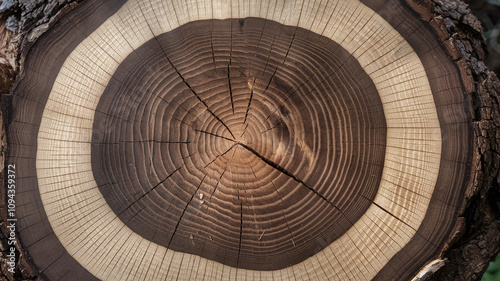 Close-up of hickory tree cut surface showcasing detailed growth rings, rich textures, and natural patterns, ideal for woodworking, nature themes, or rustic design elements.