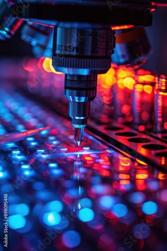 Close-Up of High-Tech CNC Machine in Action with Vibrant Blue and Red Lighting in a Modern Manufacturing Facility