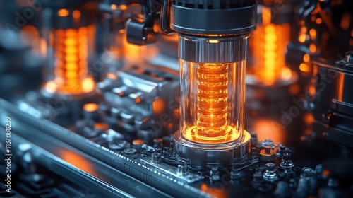 Close-Up of High-Tech Vacuum Tubes Glowing with Orange Light in a Futuristic Machinery Setting Leveraging Vintage and Modern Technology Elements