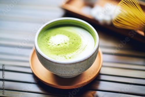 closeup of hot matcha latte with frothy art in a ceramic cup