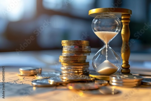 Close-up of Hourglass Next to Stack of Coins on Desk