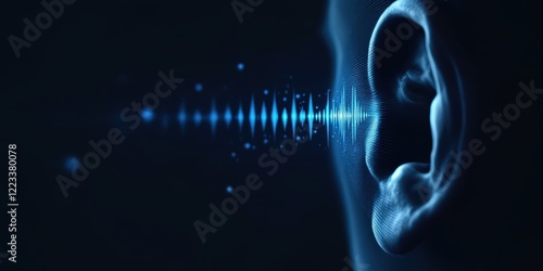 Close-up of human ear with sound waves. Hearing concept for health, technology, music, and science education. Use for awareness campaigns, presentations, and medical brochures.