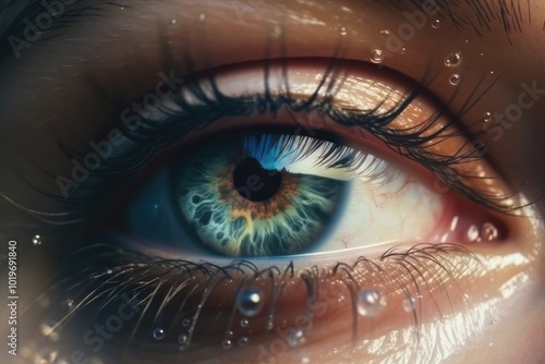 Close-up of human eye with reflections, detailed iris, moist eyelashes, captivating look, eye detail concept