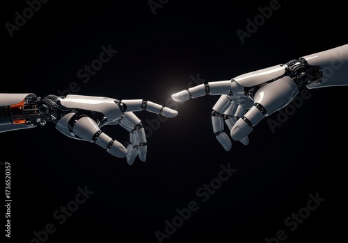 Close-Up of Human Hand Reaching to Touch Glowing Robotic Hand with Futuristic Background