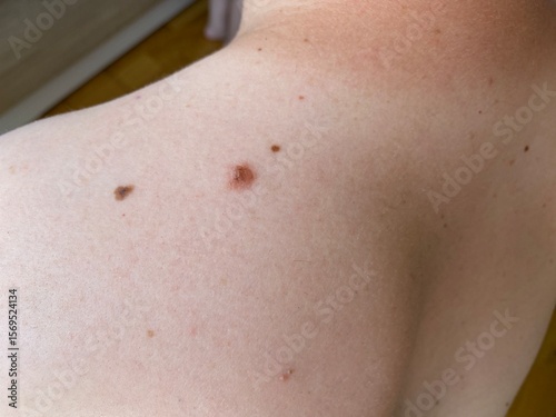 Close-up of human moles on different parts of the body. Natural skin texture with various types of moles (flat, raised, with hair). Useful for dermatology, skin cancer awareness, or medical education.
