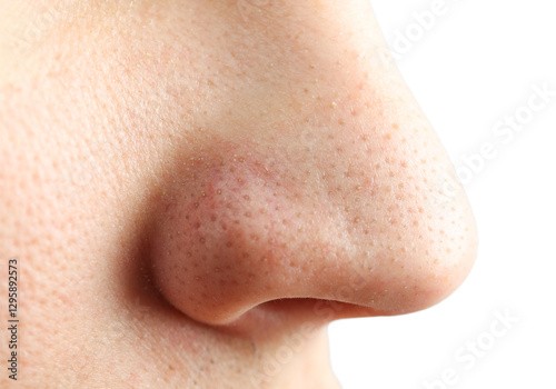 Close-up of human nose, skin texture, pores visible, neutral lighting, hyper-realistic, macro photography, dermatology study, pale skin tone, anatomical detail, high resolution, studio shot, medical