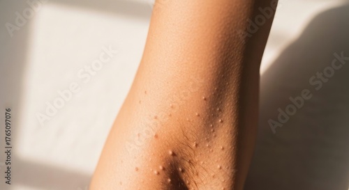 Close-up of human skin with small, raised bumps, textured by goosebumps in sunlight