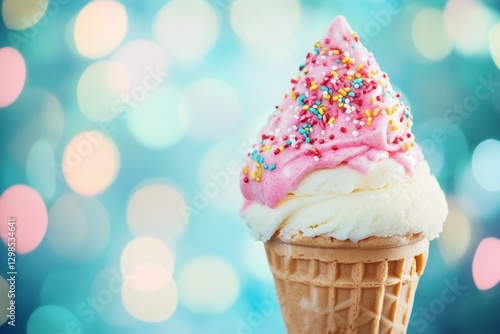 Close-up of ice cream cone with pink toppings and sprinkles against blue bokeh background