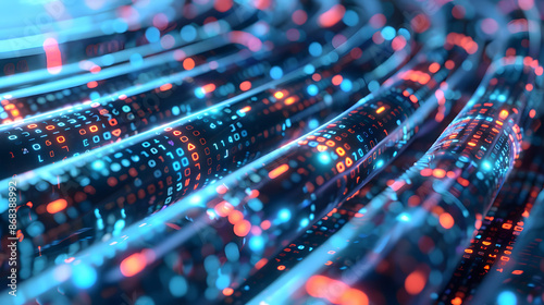 Close-up of illuminated data cables representing high-speed data transmission. Ideal for technology and digital infrastructure themes.