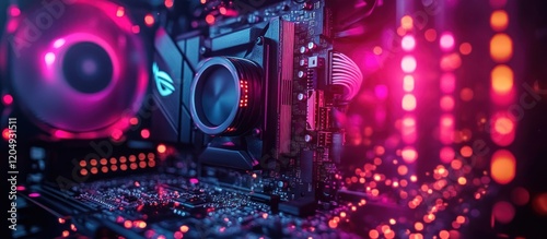Close-up of illuminated PC components, motherboard, graphics card, and cooling fan.