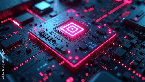 Close-up of illuminated pink and blue microchip on circuit board