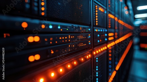 Close-up of illuminated server racks in a data center with blue and orange lights