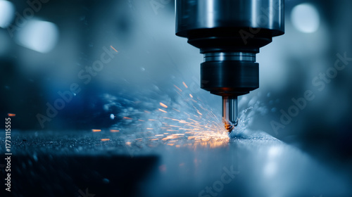 Close-up of industrial CNC machine tool creating sparks while grinding metal concept of innovation, precision, and mechanical strength. industrial process, CNC grinding, metallurgy