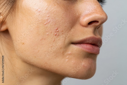 Close-up of inflamed acne on female cheek highlighting skin texture and blemishes