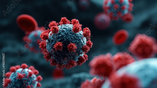 Close-up of influenza virus and coronavirus in the body. Medical concept of scientific research in virology and microbiology
