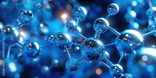 Close-up of interconnected shiny blue spheres representing a molecular structure on a blue blurred background with reflective surfaces and soft glowing lights