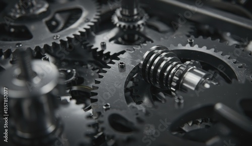 Close-up of interlocked gears and cogs in a metal mechanism,