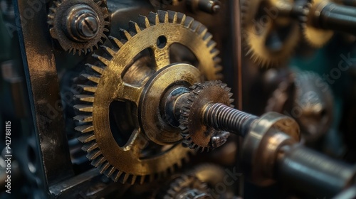 Close-up of Interlocking Gears and a Screw in an Antique Mechanism