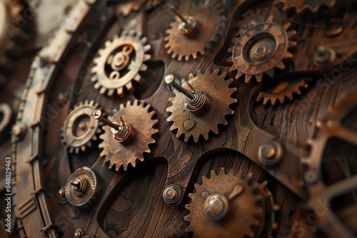 Close-up of intricate brass gears interlocked, creating a complex and intricate machinery.