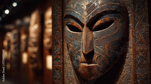 Close-up of intricate carved african mask exhibit in dark museum gallery featuring many artifacts