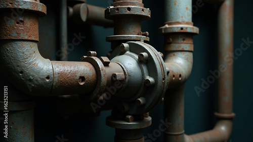 Close-up of intricate industrial pipes and valves, showcasing complex machinery details. High resolution, realistic lighting, detailed textures.