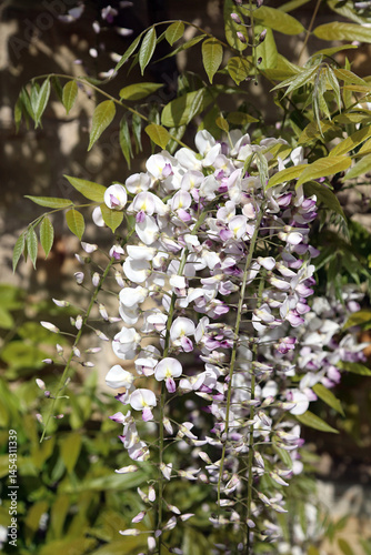 Closeup of Japanese wisteria blooms against a stone wall, Derbyshire England