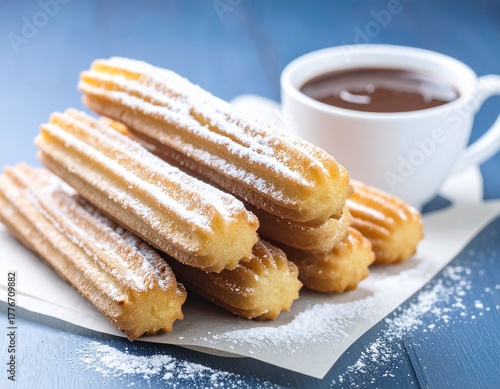Close-up of juicy golden churros, generously sprinkled with powdered sugar and aromatic cinnamon
