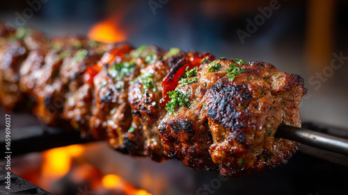 Close-up of juicy kebabs grilling over open flames.