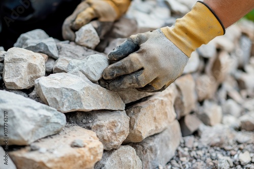 Close-up of landscaper laying stones for garden wall with level and gloves
