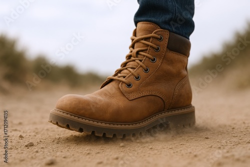 Close-up of Leather Boot Stepping on Sandy Ground with Jeans on a Cloudy Day