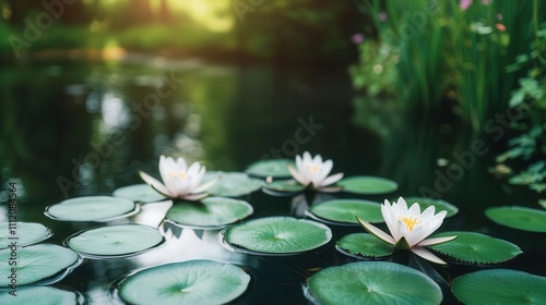 Close-up of lilypads on a still pond, surrounded by dense greenery and wildflowers, soft sunlight filtering through, creating a peaceful atmosphere, pond lilypads greenery