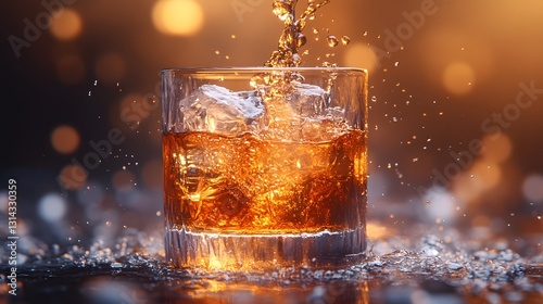 Close-up of liquor being poured into a glass, detailed splashes, dramatic lighting, realistic textures
