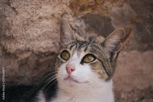closeup of little cat looking up next to a stone wall