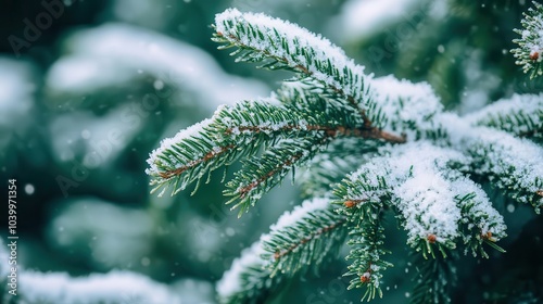 close-up of lush green fir tree branches dusted with snow, capturing the essence of winter and holiday spirit, with soft lighting enhancing the serene atmosphere