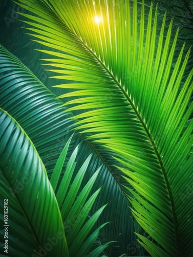 Close-up of lush green tropical palm leaves with intricate texture and veins exposed under intense warm backlight illumination