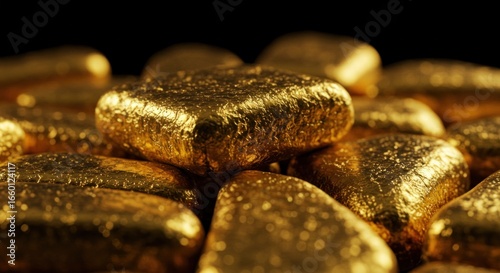 Close-up of lustrous gold nuggets, gleaming brightly against a dark background.
